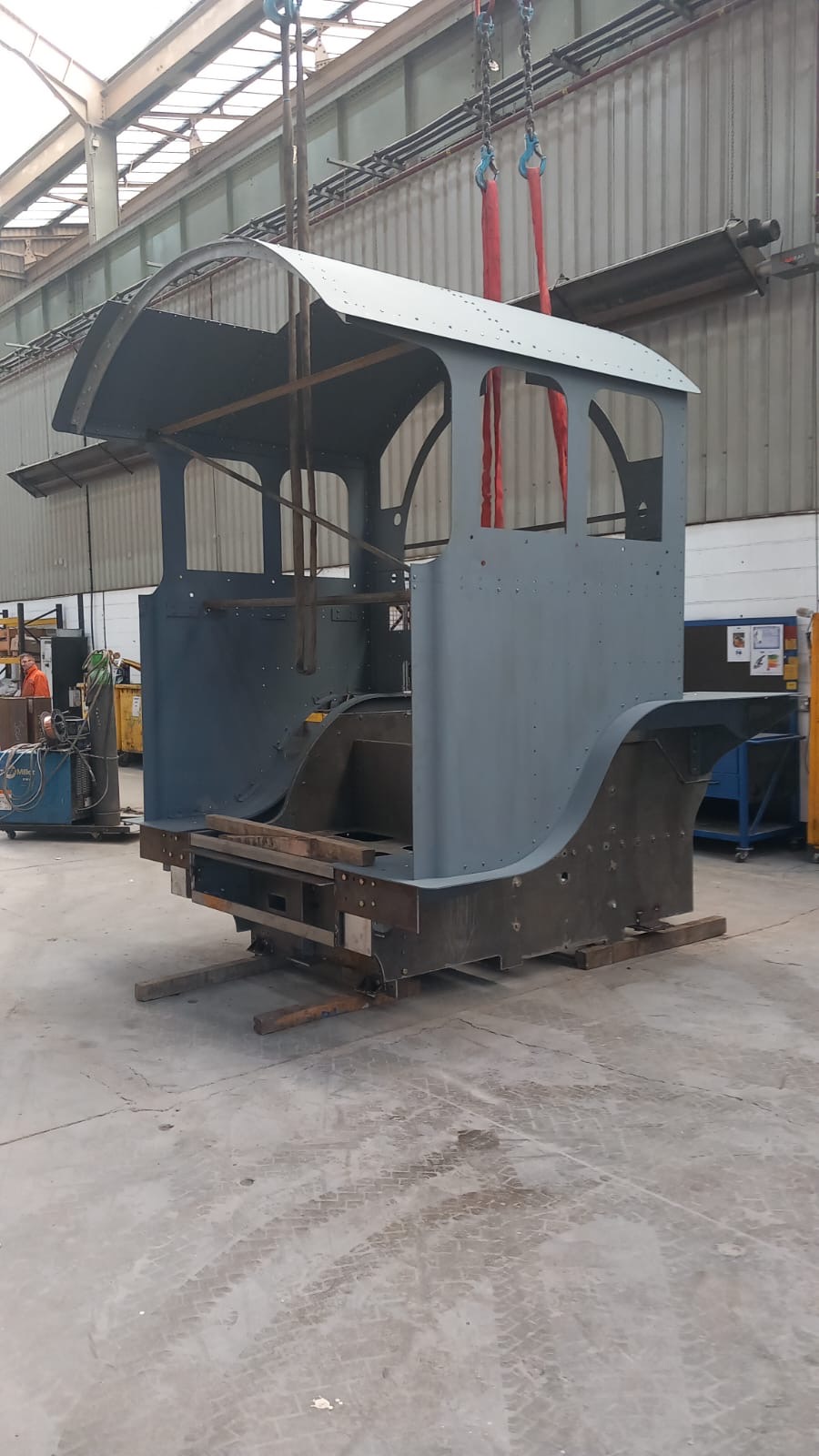 The cab, being constructed at Elvar Engineering in Buckinghamshire, has arrived at the premises of Diamond Engineering for the Open Day on Saturday. It's mounted on a jig representing the back of the chassis. When returned to to Elvar, it will have the window frames and glass added and start to be fitted out.