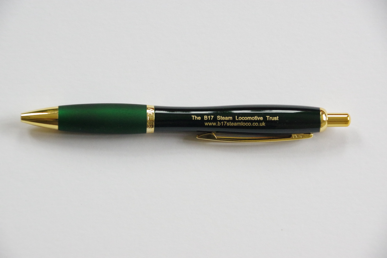 A superb pen, in a pleasant green colour, with a line drawing of a B17 and the words "The B17 Steam Locomotive Trust and www.b17steamloco.co.uk, both in a gold colour.